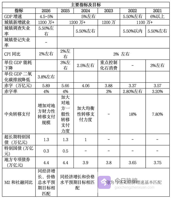 在对去年12月中央经济工作会议的解读中,我们曾提出2026年GDP增长预期目标将以区间形式略下调至4.5%—5%(参见财闻报道《定调2026!中央经济工作会议六大关注点解读》)。本次政府工作报告提出2026年经济增长预期目标正是4.5%—5%,并提出在实际工作中努力争取更好结果。回顾历史,除2020年因情况特殊未设定具体增长目标以外,这是改革开放以来,首次经济增长预期目标落入5%及以下区间。
