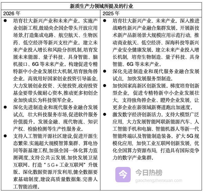 新质生产力领域所提及的行业有所变化。根据本次政府工作报告,今年更聚焦关键核心技术领域(如集成电路、生物医药),新增“未来能源、脑机接口”等未来产业方向,弱化了消费端智能终端的直接提及。2025年处于新兴产业“应用示范”阶段(如5G规模化、智能终端普及),重点是让技术落地;2026 年则进入“支柱化培育”阶段,需要聚焦集成电路、生物医药等卡脖子领域,同时布局未来能源、脑机接口等下一代技术,推动产业从 “应用” 向“支柱”升级。在未来产业领域,增加建立“未来产业风险分担机制”的说法,这是为了降低创新试错成本,激活从初创到领军的全链条创新活力,完善产业生态。