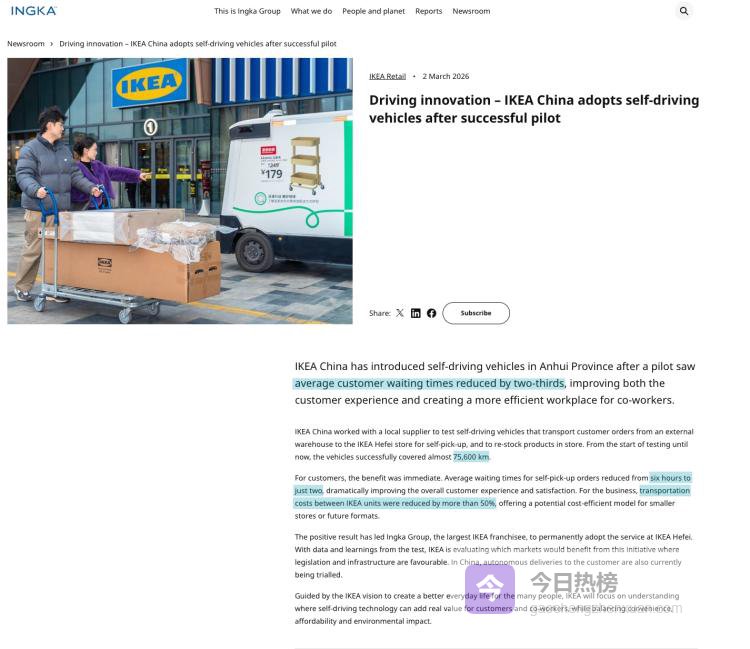 英格卡集团提到,依托试点积累的数据与经验,宜家正在评估具备良好法规环境和基础设施的潜在市场,以推广无人配送服务。此外,宜家也在中国市场推进面向终端顾客的无人配送试点工作。