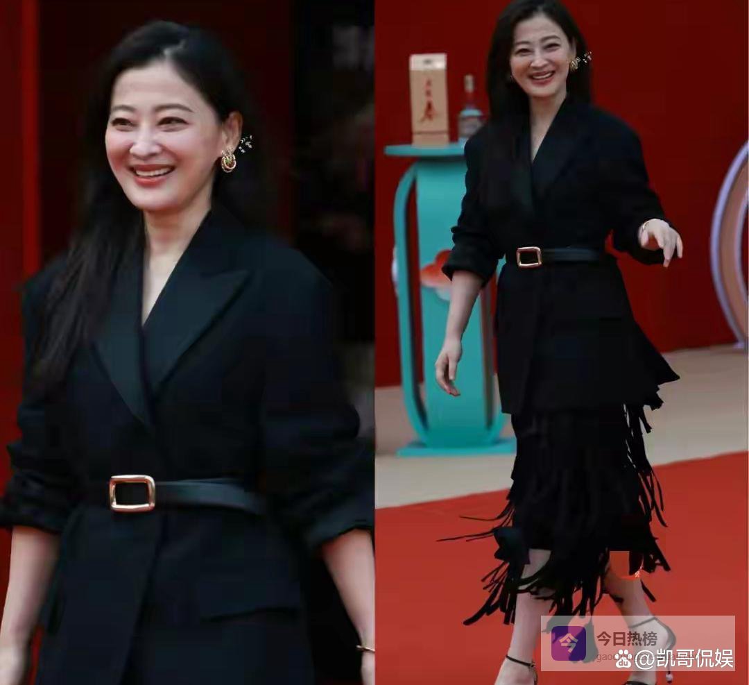 反观梅婷,她选择了一套黑色利落套装,流畅的剪裁贴合身形,弱化了年龄感,凸显出成熟女性的沉稳气场。