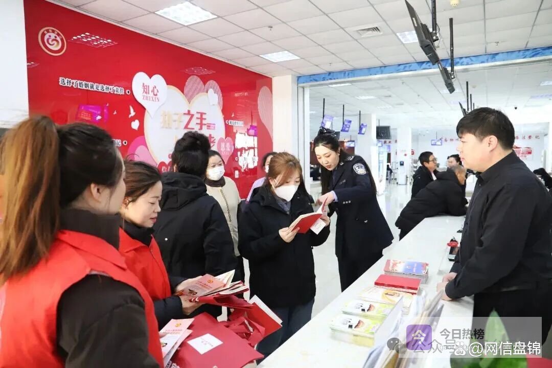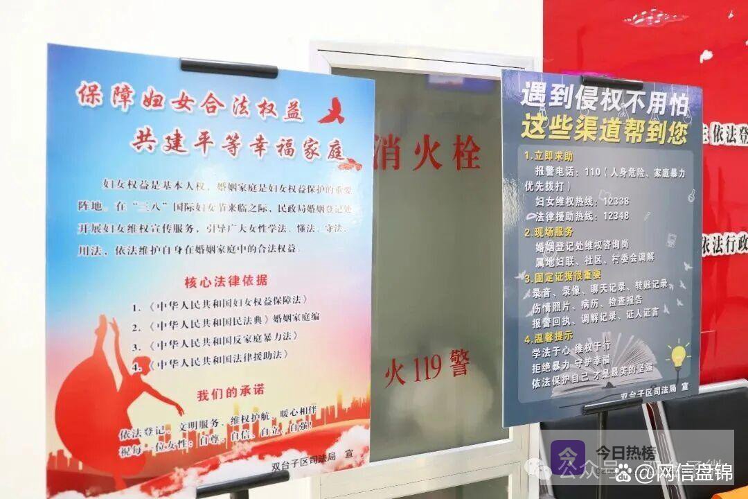 两块主题普法展板上,“保障妇女合法权益,共建平等幸福家庭”鲜明传递维权理念,“遇到侵权不用怕,这些渠道帮到您”清晰列明报警电话、妇女维权热线、法律援助热线等实用信息,让过往群众一目了然、便捷取用。工作人员以婚姻登记窗口为前沿阵地,把法治宣传与婚姻家庭服务紧密结合,引导群众树立平等、文明、和睦的家庭观念。