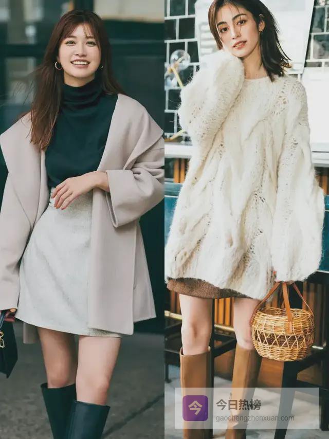 身材优越的女子最懂用衣物衬出盆骨,短大衣内搭黑色针织衫,与高腰短裙组合,脚上踩着一双黑色中筒靴,微露膝盖肌肤,灵动俏皮,下衣失踪的穿法利落又显身材。