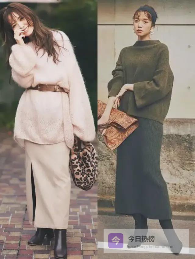 或是穿着一件微宽松的毛衣,搭配上灰色的直筒开叉半裙,脚上穿了一双黑色马丁靴,这样的搭配有一种慵懒随性的温柔气息。