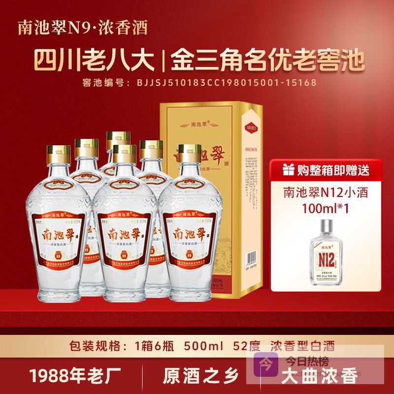 南池翠白酒52度N9浓香型白酒 四川纯粮食酒 礼盒装节日送礼宴请酒 500ml 52度 500mL 6瓶 (赠1瓶N12小酒)¥