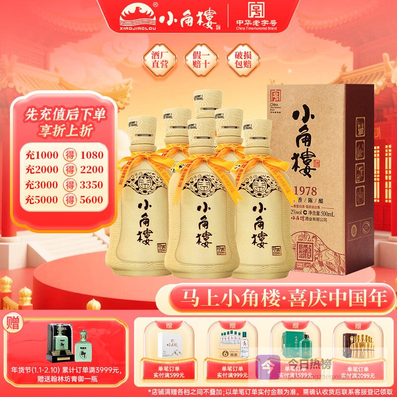 小角楼1978 52度浓香型白酒口粮酒 四川白酒礼盒装固态纯粮粮食口粮酒 52%vol 500mL 6瓶 升级版带3礼品袋¥