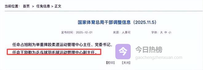 “正式任命王励勤为乒乓球羽毛球运动管理中心副主任。”