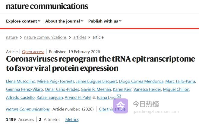[1]Muscolino, E., Puig-Torrents, M., Buigues Bisquert, J. et al. Coronaviruses reprogram the tRNA epitranscriptome to favor viral protein expression. Nat Commun (2026). doi:10.1038/s41467-026-69700-w.