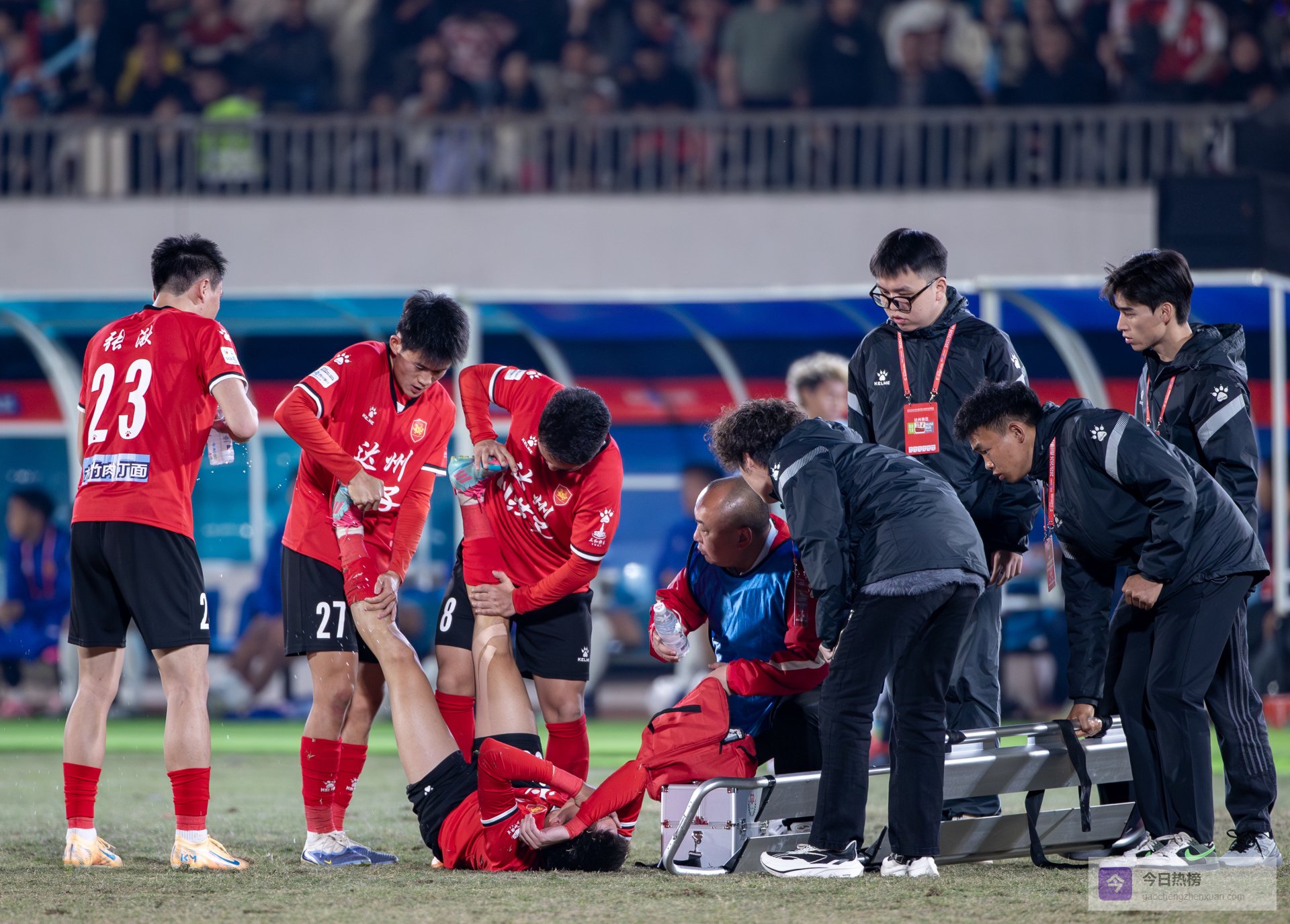 达州川汉子队一名球员腿部抽筋,队友正在为他进行拉伸