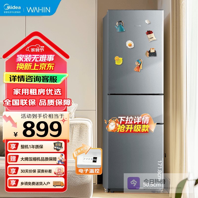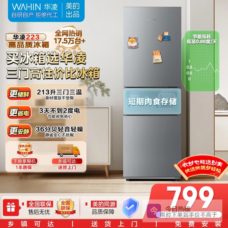 美的出品 华凌冰箱三门电冰箱节能低音三门三温三开门小型家用租房冷冻冷藏小冰箱HR-223T¥