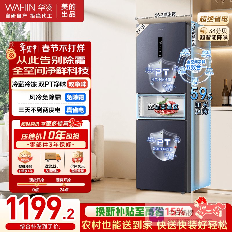 华凌冰箱美的出品282三门超薄一级能效风冷无霜双变频变温冷藏冷冻净味冰箱家电国家补贴20%HR-282WTPZ¥
