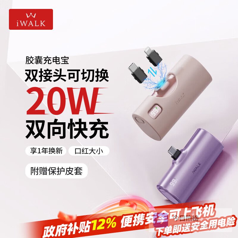 爱沃可(iWALK)新年礼物快充20W胶囊充电宝5000毫安可换接头适用苹果于iphone17/16/15华为小米迷你便携电源粉¥