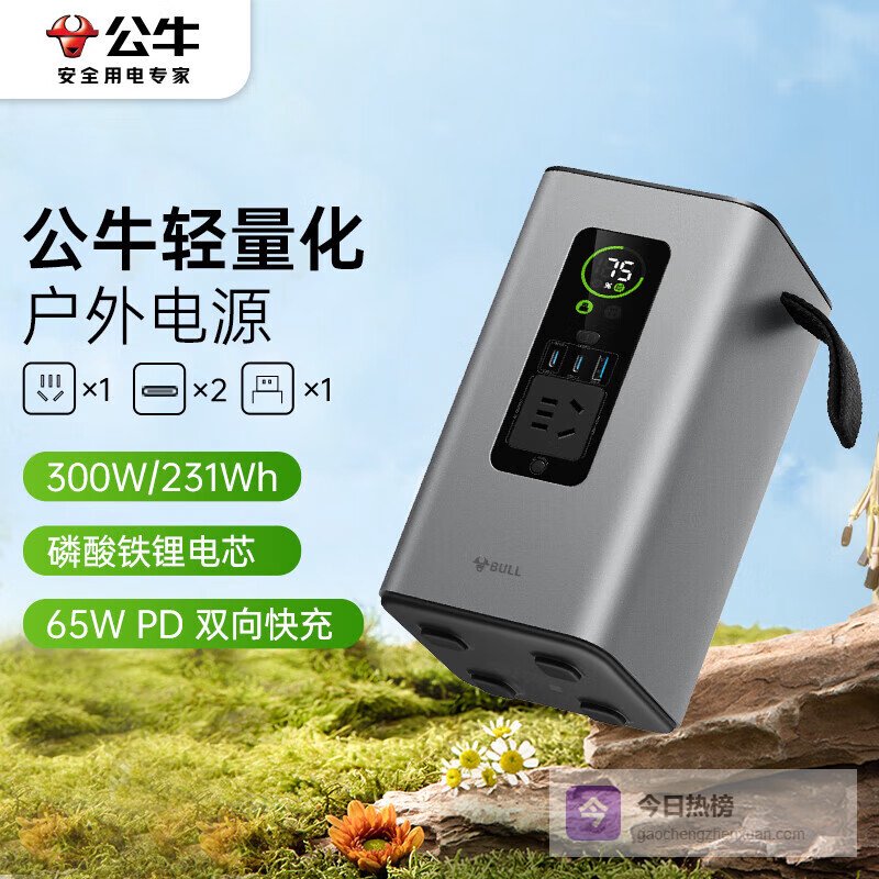 公牛【3C认证】300W快充移动户外电源220V PD65W快充 约7.2万mAh磷酸铁鲤电芯露营停电应急备用充电宝¥