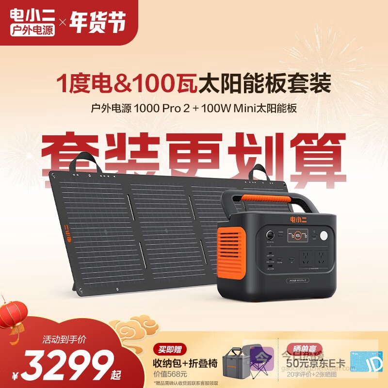 电小二【1度电 100W光充套装】快充户外电源1500W大功率大容量220V移动电源车载露营应急蓄电池¥