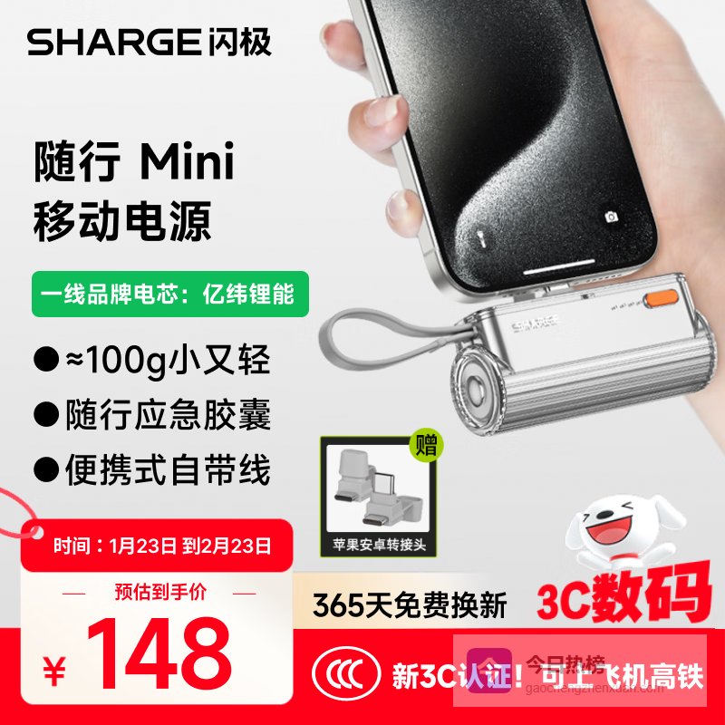 SHARGE【新3C认证】随行mini胶囊充电宝迷你便携可上飞机自带线快充口红移动电源适用iPhone17华为小米16¥