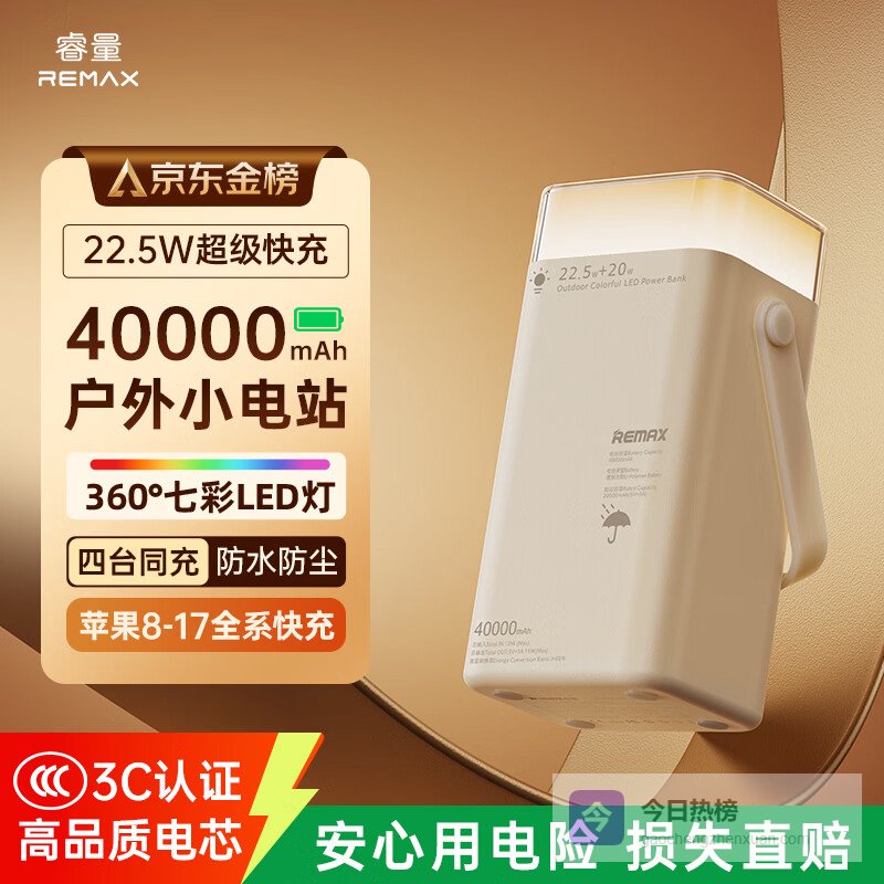 remax睿量40000毫安时充电宝【七彩LED灯】22.5W快充大容量户外露营应急PD移动电源兼容苹果17华为小米¥