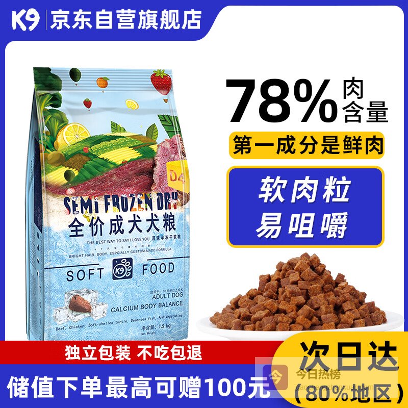 【京东自营】K9软狗粮成犬老年犬通用半冻干无谷鲜肉犬粮1.5kg/3斤¥