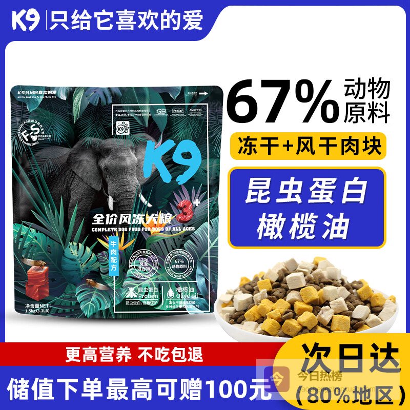 【京东自营】K9狗粮风干冻干三拼成犬幼犬中小型通用低敏昆虫蛋白牛肉味1.5kg¥