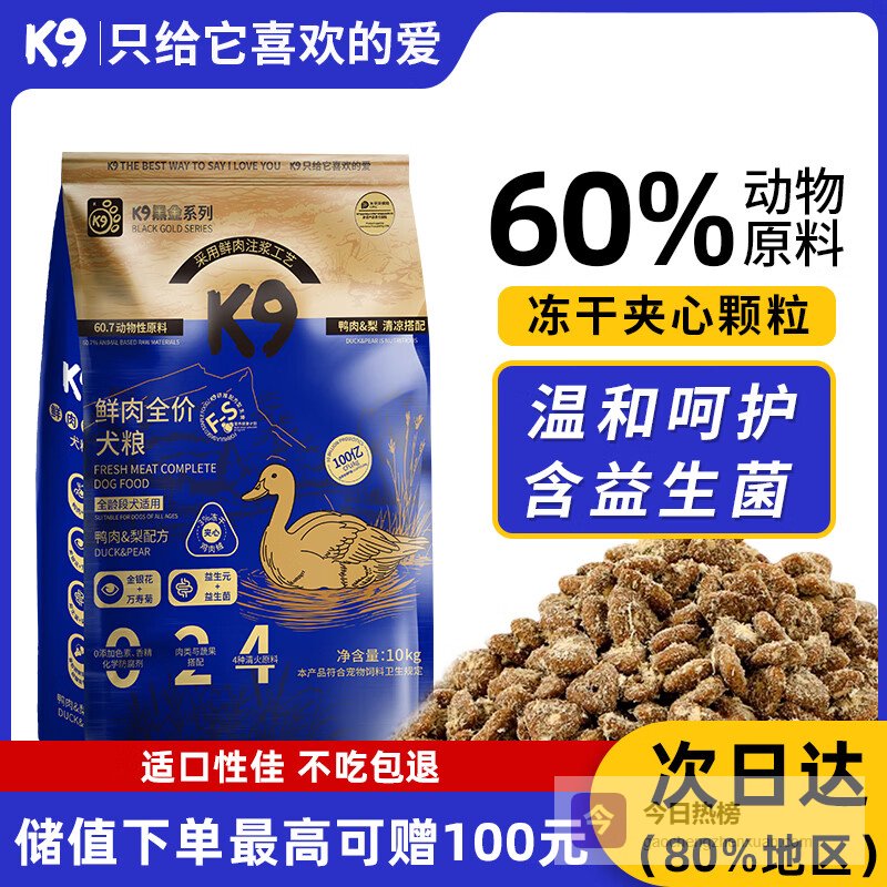 【京东自营】K9狗粮鲜肉酶解冻干鸡肉绒小型犬中大型成幼犬通用10kg/20斤¥