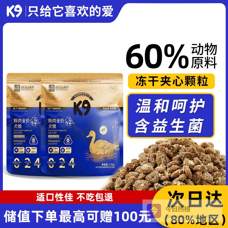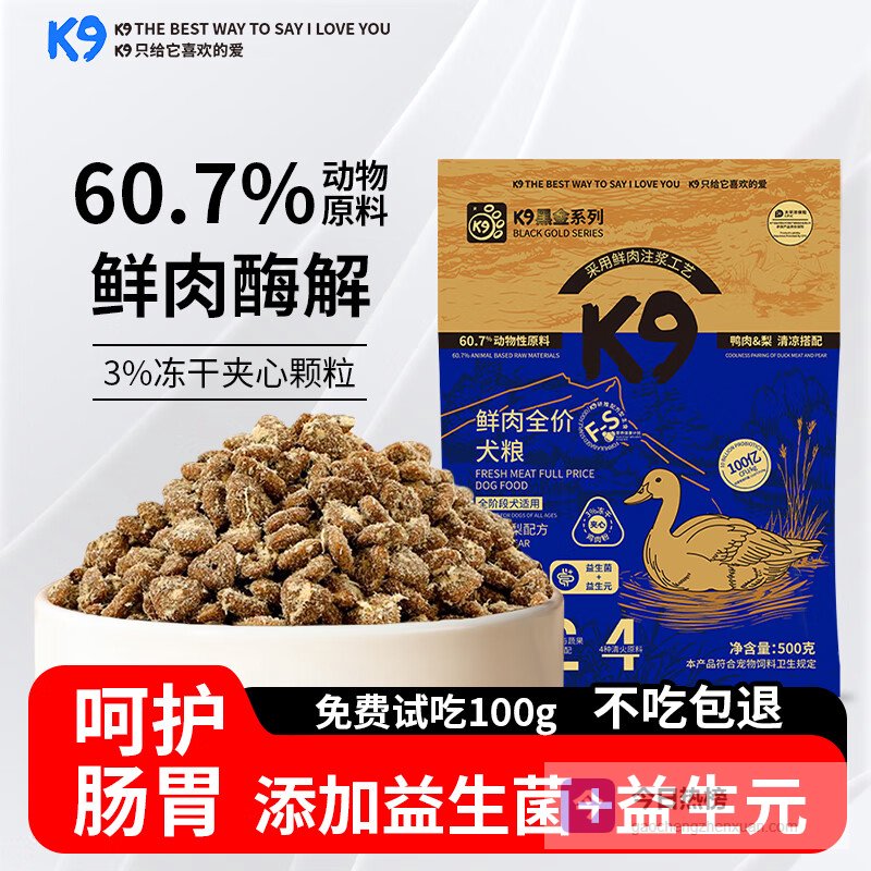 【品牌直营】K9成犬粮全犬宠物犬狗主粮大中小型犬通用狗粮升级款黑金系列鸭肉梨配方试吃装500g/1斤¥