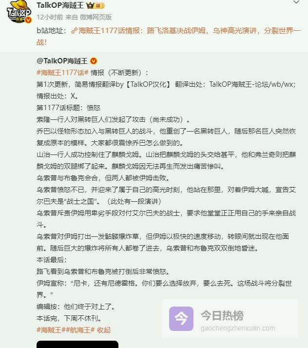 我们知道本周更新了海贼王最新一期的漫画1177话,目前漫画情报也已经更新,本话表态为“愤怒”,而这个愤怒之人,正是乌索普。