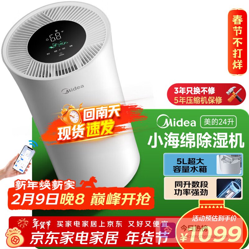 【京东自营】美的24升小海绵除湿机除湿量24升/天WIFI智控正负离子除菌回南天家用50㎡轻音除湿器¥