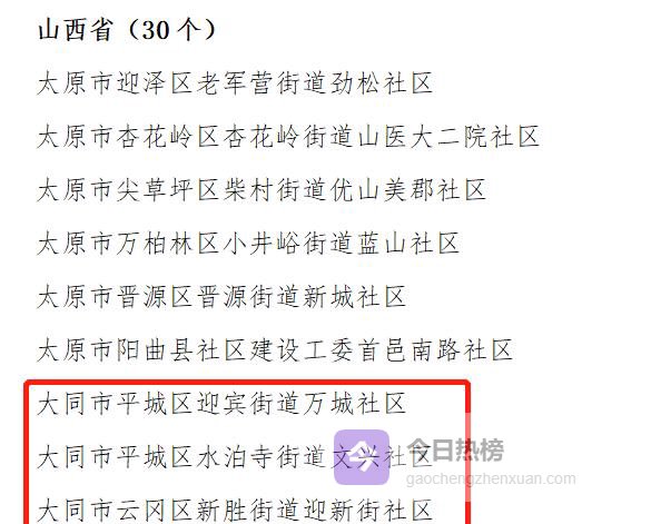 国家卫健委与全国老龄办联合下发《关于命名2022年全国示范性老年友好型社区的通知》,平城区迎宾街道万城社区、平城区水泊寺街道文兴社区、云冈区新胜街道迎新街社区榜上有名。至此,我市已有6个社区跻身全国示范行列,养老服务“样板间”持续扩容。