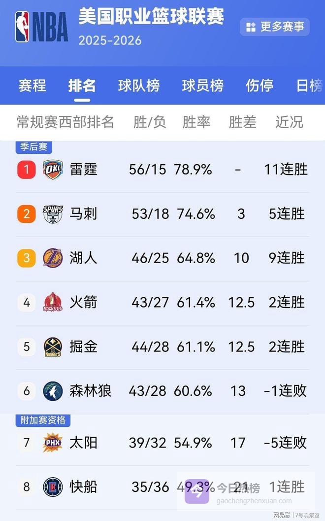 最新积分榜上,火箭43胜27负,掘金44胜28负,胜率只差0.3个百分点,几乎持平。加上46胜25负的湖人、43胜28负的森林狼,西部3-6名的四队混战,谁都没把握稳坐钓鱼台。火箭刚从两连败湖人的阴影里走出来,接下来要碰森林狼、灰熊,稍有不慎,第4的位置就会被掘金抢走。