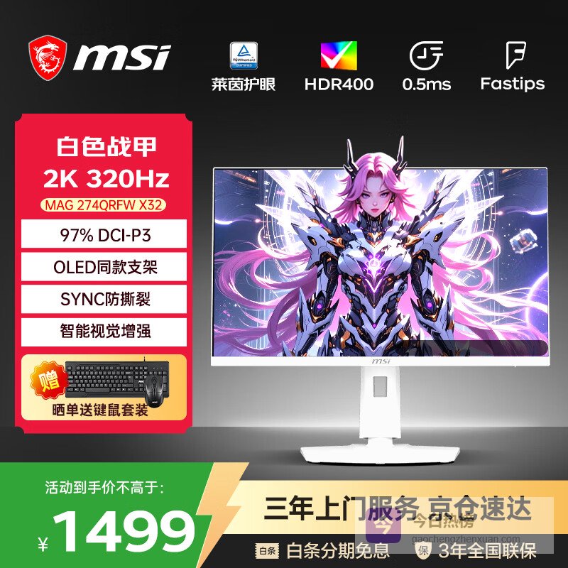 微星(MSI)27英寸2K原生300Hz HDR400 0.5msGTG Fastips快速液晶 低蓝光显示屏游戏电竞显示器 MAG 274QRFW X32 2K320Hz¥
