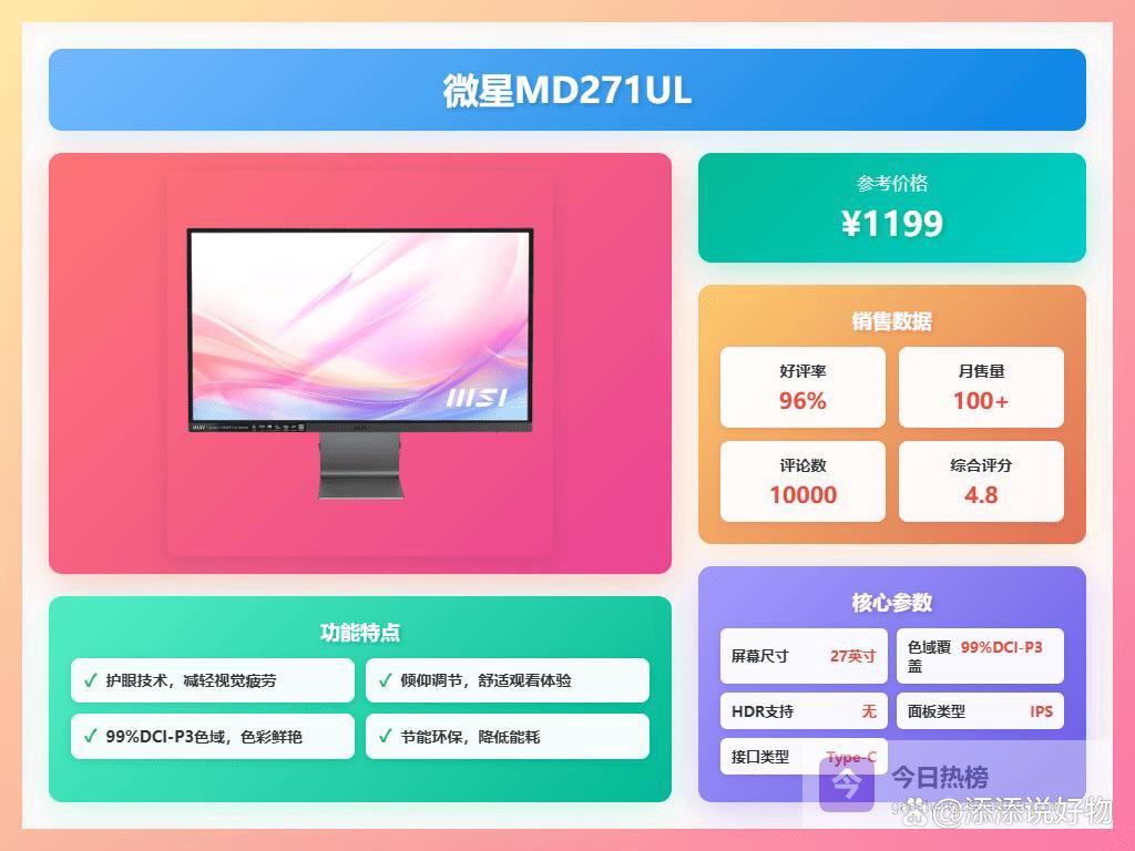 4、微星MD271UL这款微星Modern MD271UL显示器,27英寸搭配4K分辨率,画面清晰度没得说,色彩也相当给力。它拥有99%DCI-P3色域和95%Adobe RGB色域,色彩过渡平滑。采用IPS面板,可视角度广,无论从哪个角度看,色彩基本不失真。