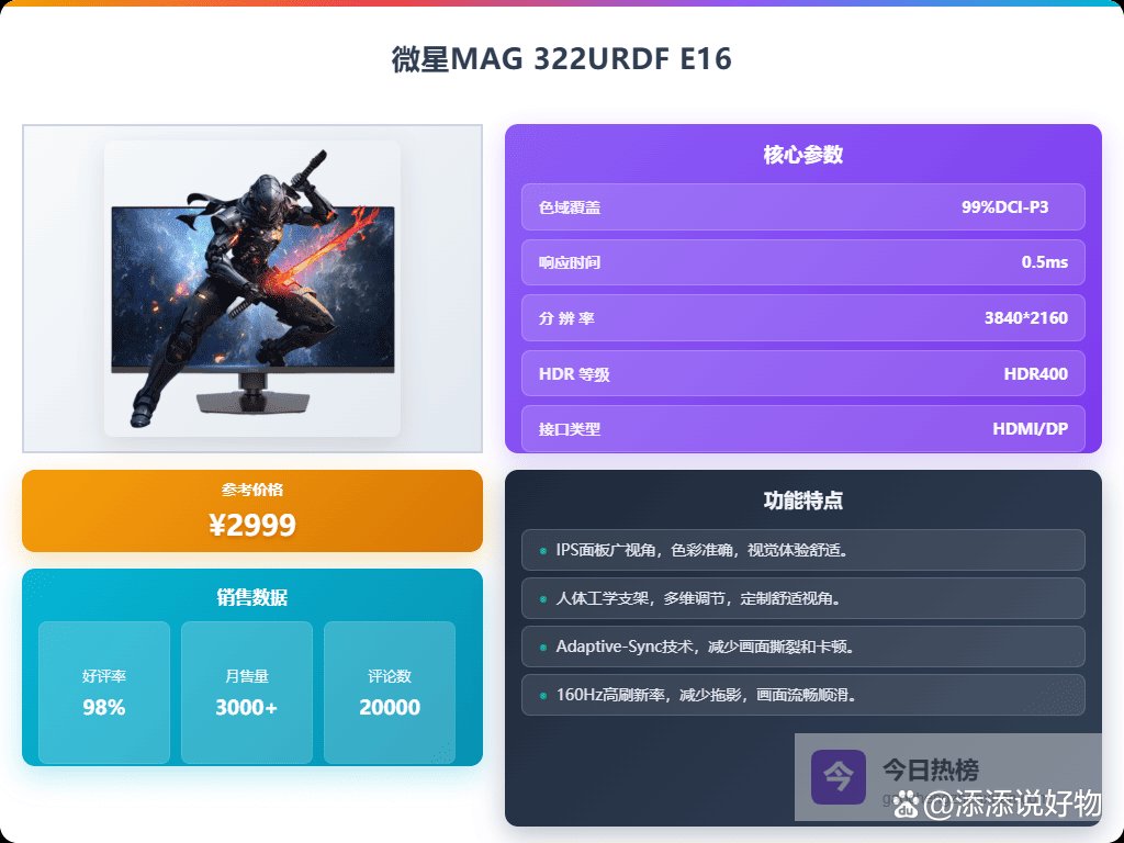 1、微星MAG 322URDF E16这款微星MAG 322URDF E16显示器,拥有31.5英寸大屏和4K超清分辨率,画面细腻。特别之处在于它支持双模显示,可以在4K 160Hz和1K 320Hz之间切换,能根据游戏或者应用场景的需求来调整,真的蛮方便的!