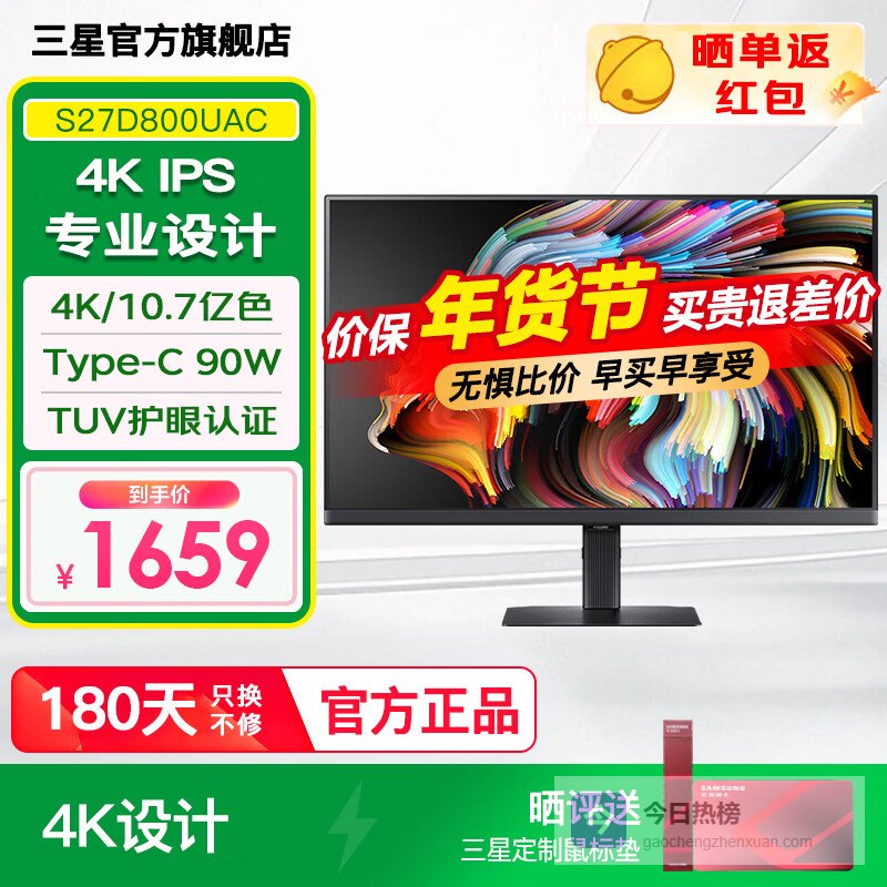 4、三星S27D800UAC这款27英寸的显示器,用起来真是眼前一亮!4K UHD分辨率让画面细节清晰锐利,色彩也足够饱满。采用的IPS面板,色彩显示准确,可视角度也很棒,从侧面看也不会有明显的色彩偏差。99% sRGB色域覆盖,对于有色彩要求的专业人士来说,也能轻松满足。