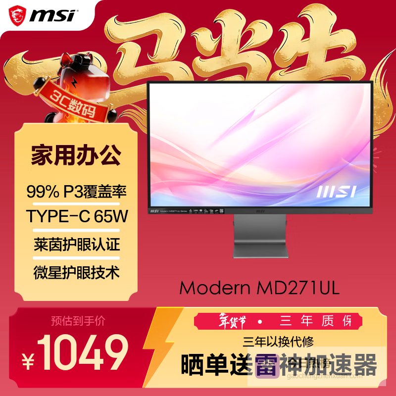 微星(MSI)27英寸 4K 65W Type-c 10Bit 99%DCIP3 莱茵低蓝光认证不闪护眼屏 微边框 家用办公显示器MD271UL¥
