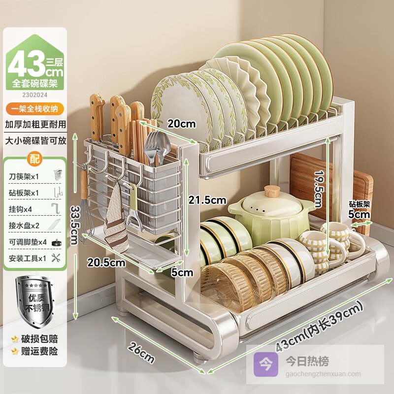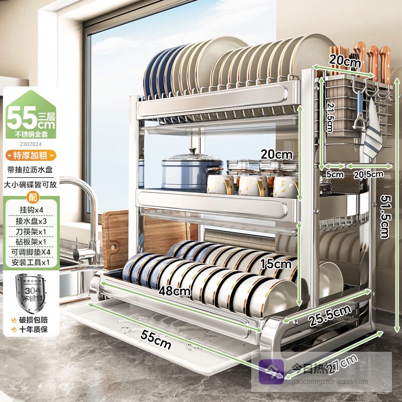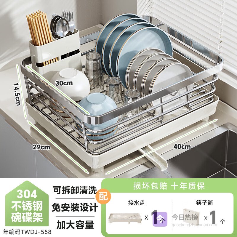 参数:304不锈钢材质、加大容量、分区收纳、碗槽位12个、碟槽位12个、加宽3cm间距、360°旋转导水管、自动排水、免安装设计、沥水功能