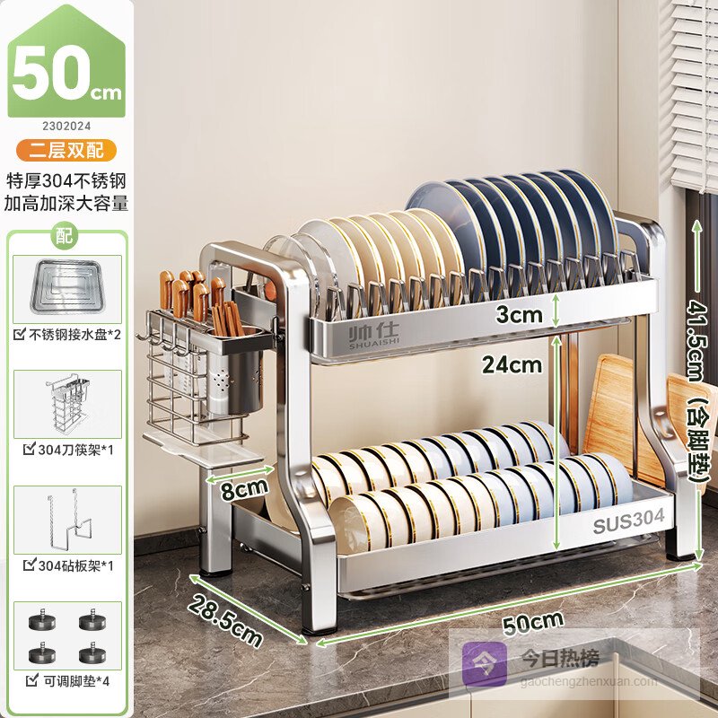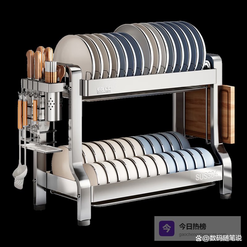 点评:这个碗碟架用料真结实,304不锈钢材质,耐腐蚀不怕水,能用很久,倒是挺耐用的。双层设计,帮你多存点碗碟,不占地方还挺方便,厨房更整齐。加厚加粗的结构,承重能力增强,不用担心放多点东西会摇晃或倒,不安全感少不少。