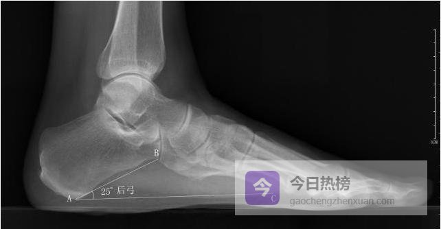 4.2.4 ◆ 后弓角 以跟骨最低点为原点,向跟骰关节最低点与第5跖骨头最低点各引一条水平线, 测量两线夹角。