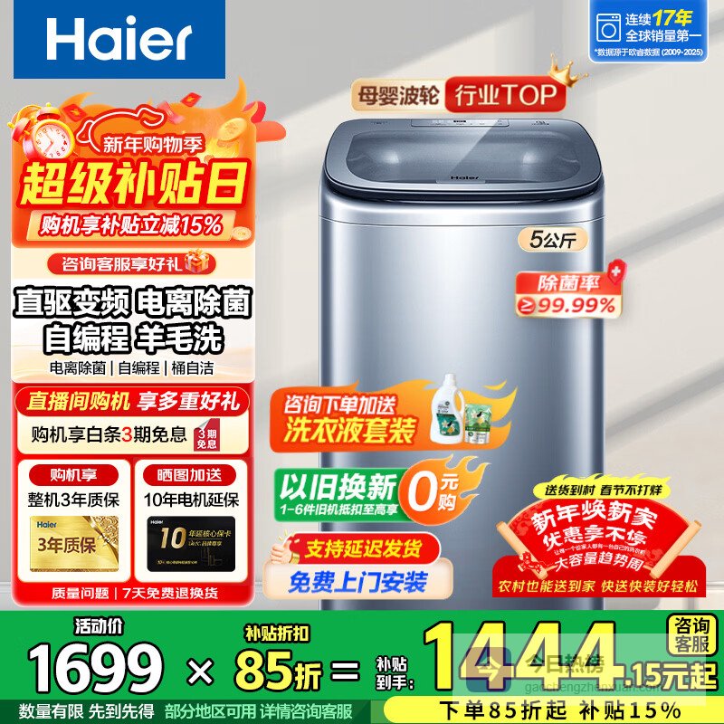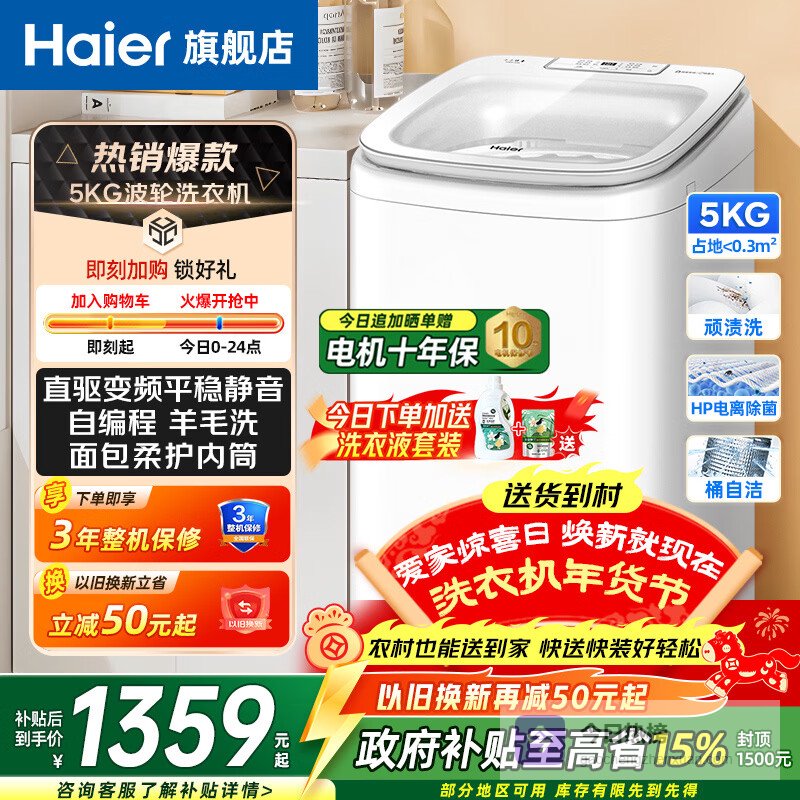 海尔5公斤洗衣机波轮直驱变频全自动一级能效迷你洗衣机小型家用婴儿儿童洗衣机电离除菌羊毛洗顽渍洗 【5kg洗衣机】直驱变频+电离除菌+自编程+桶自洁¥