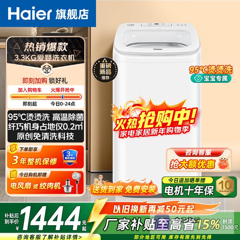 海尔3.3公斤洗衣机小型迷你婴儿宝宝内衣儿童洗衣机95℃烫烫洗免清洗全自动波轮洗衣机可加热国家补贴 冰雪白-免清洗 波轮 3.3kg 加热洗+全不锈钢内筒¥