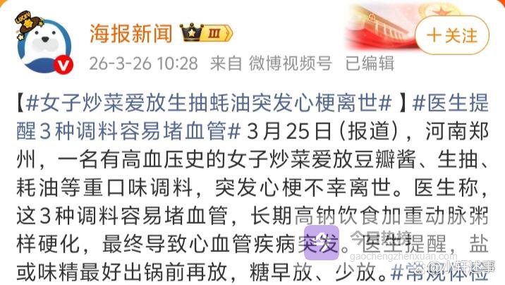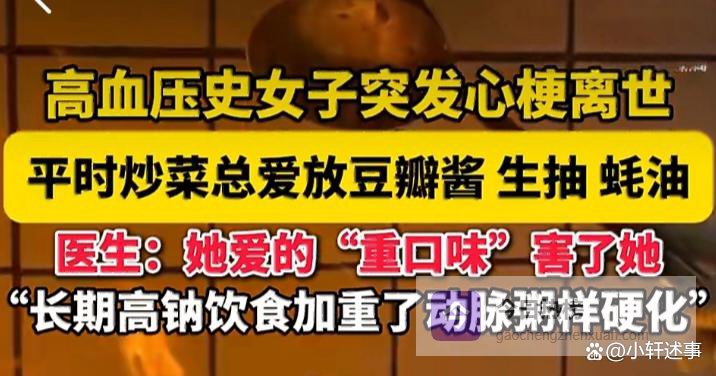 3月的郑州,春寒料峭。一则新闻像一块重石砸进了无数家庭的日常:一位有高血压史的女子,因炒菜偏爱放豆瓣酱、生抽、蚝油,最终突发心梗离世。