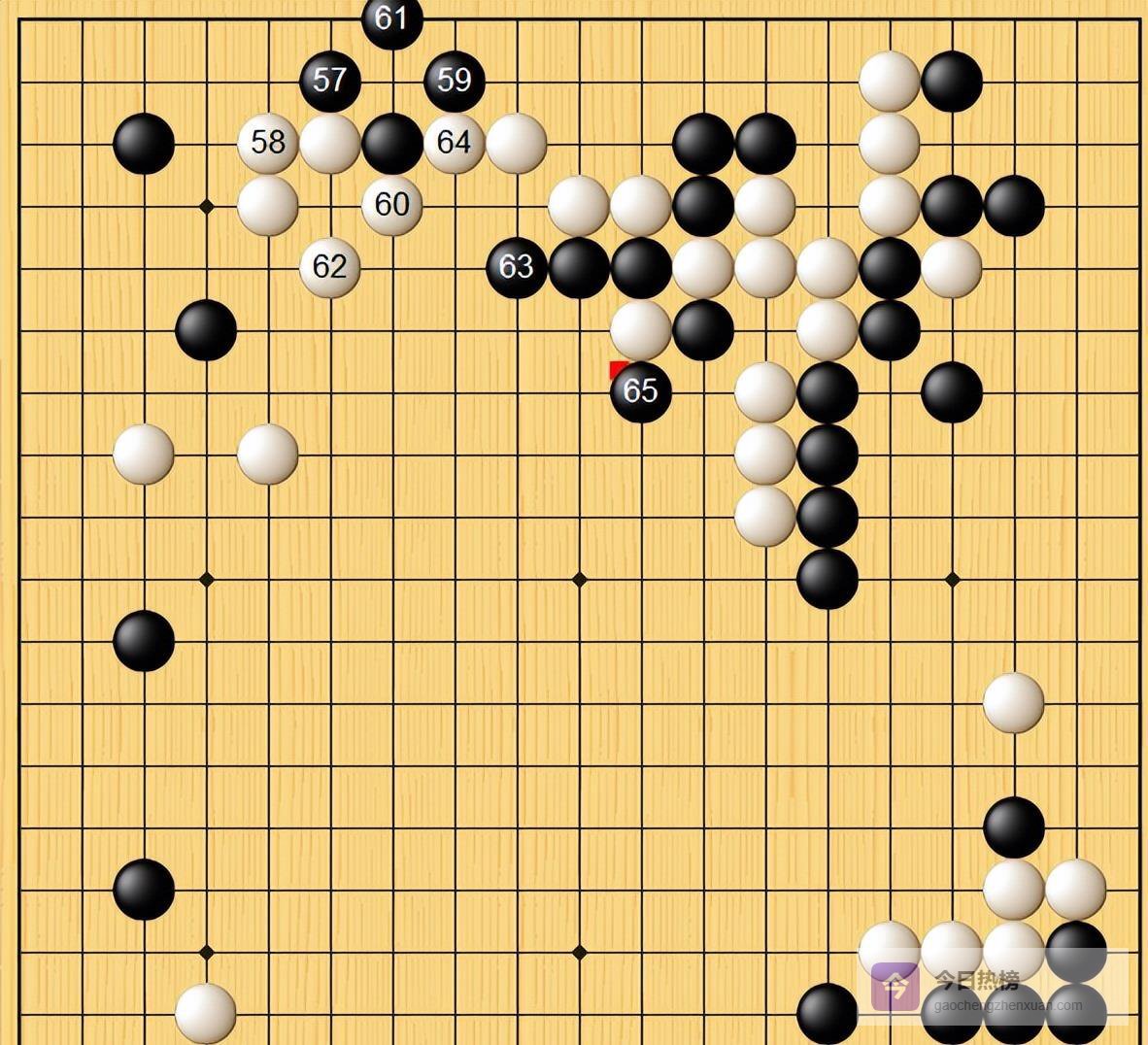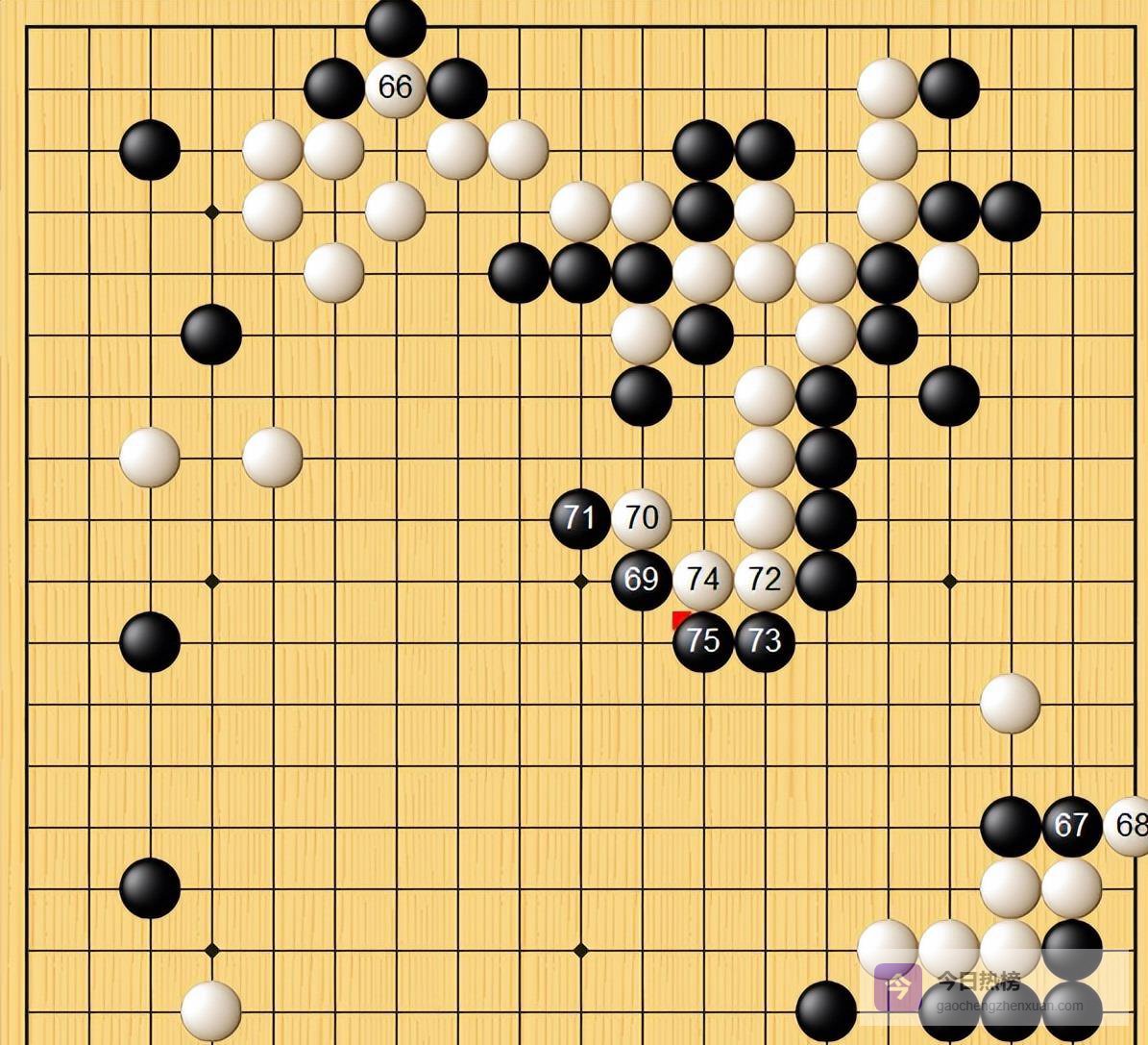 然后,井山的节奏就完全变了。 从黑47开始,一招比一招紧,朴廷桓明显吃了一惊,开始处长考,但时间已经悄悄流逝。 最绝的是黑69那步大跳,这被看作是“假道伐虢”之计。