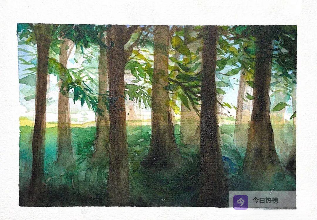 他把一棵长在坡地的水松命名为《幽境》,“树名是它给我的暗号,提醒我慢下来”。从拍照、选景到深夜回宿舍补光,他不断问自己:到底想留住什么?老师说:“先画树皮,再画风。”于是他对着同一棵树画了五张草图,最终把“呼吸感”留在画面里。