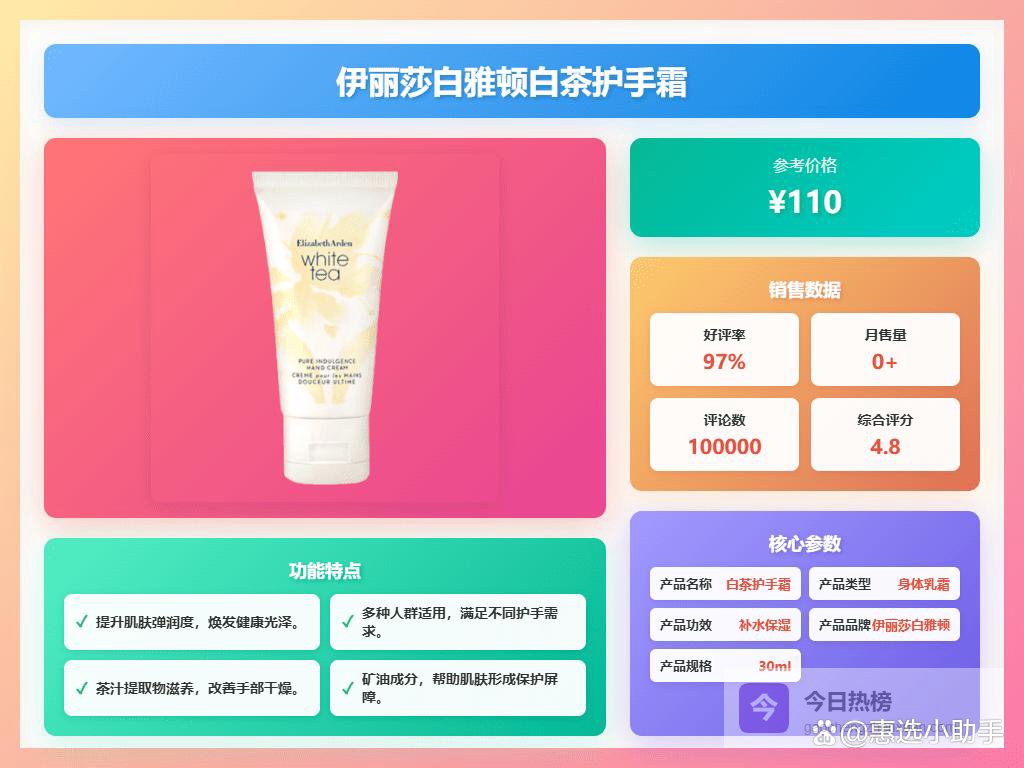 看完大家的评论,感觉伊丽莎白雅顿的护手霜确实值得期待一下,滋润保湿是肯定的,而且持久留香听起来就很吸引人,毕竟谁不想拥有香香软软的双手呢?而且2026年都必看,感觉错过就要后悔!不过具体哪款好用,还是要多做做功课,毕竟每个人的肤质和喜好都不一样嘛。下面给大家挑了3款,感兴趣的可以了解下。