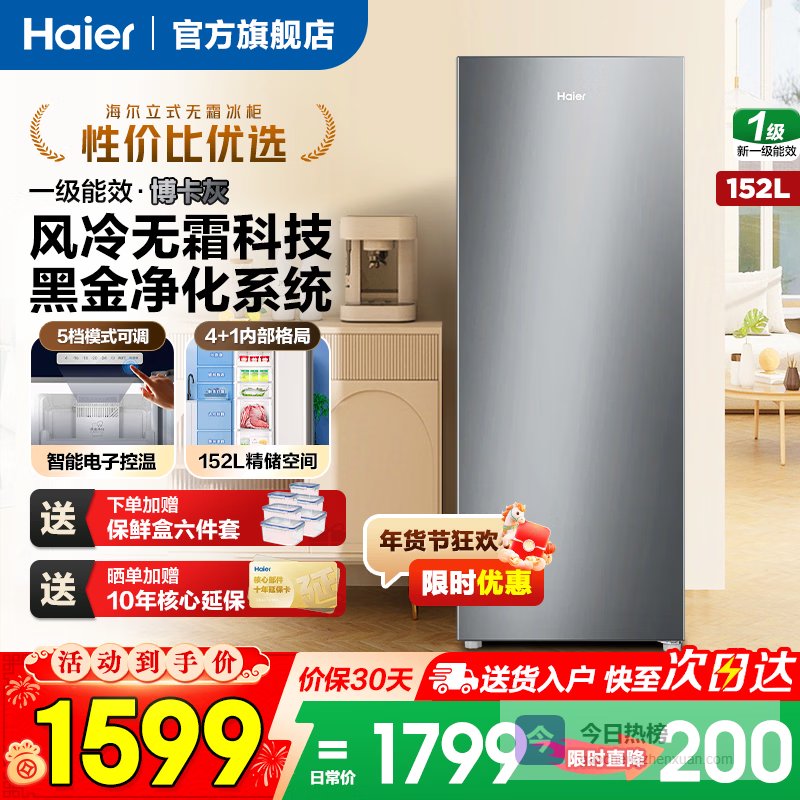 海尔(Haier)冰柜家用 立式新一级节能抽屉式小冷柜 深冷速冻海鲜冷冻柜冷藏小冰柜 152升 +风冷无霜+黑金净化抗菌+电子控温¥