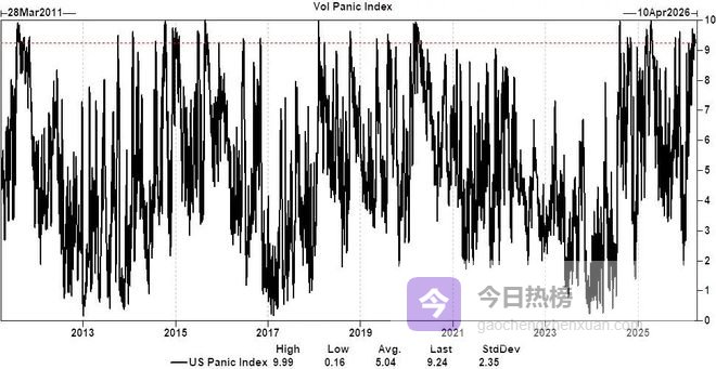 恐慌指数创15年纪录:高盛美股波动恐慌指数达9.2分(满分10分),已连续17个交易日处于恐慌区间,为近15年最长连续恐慌纪录之一。