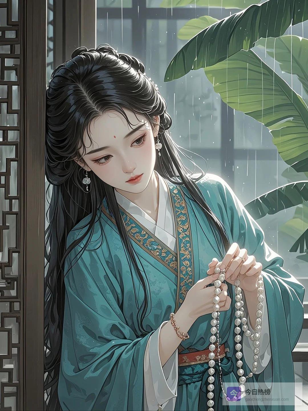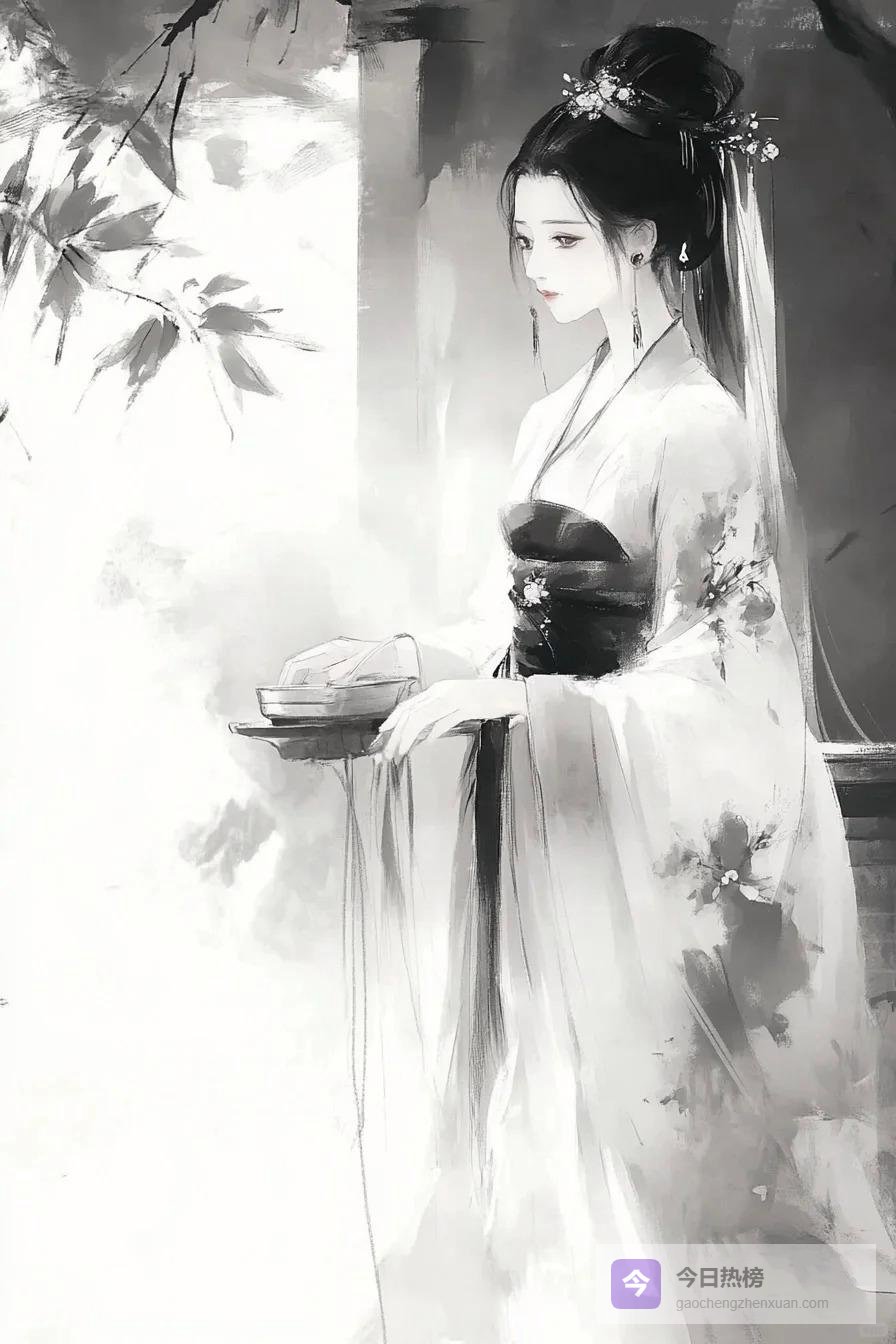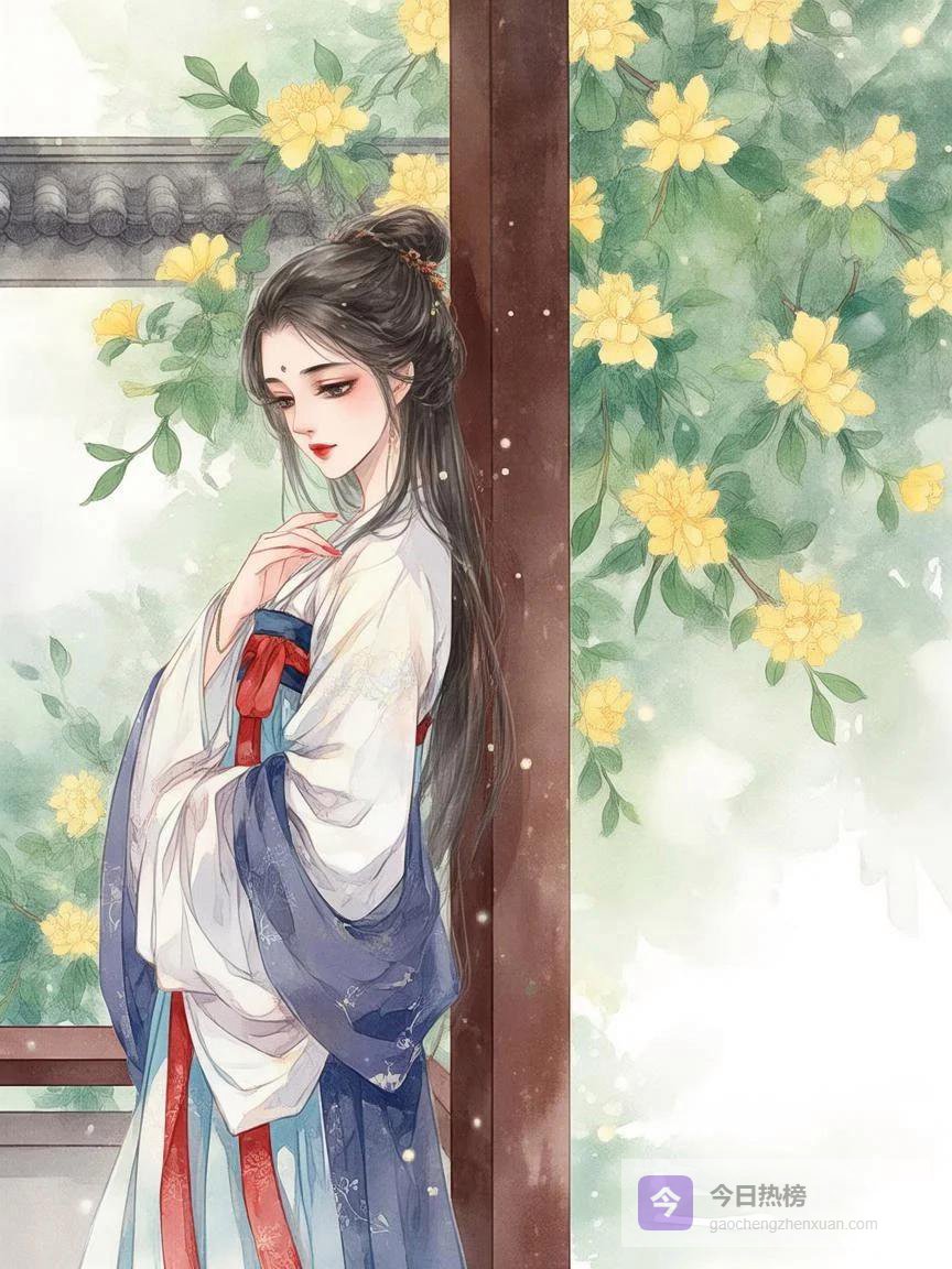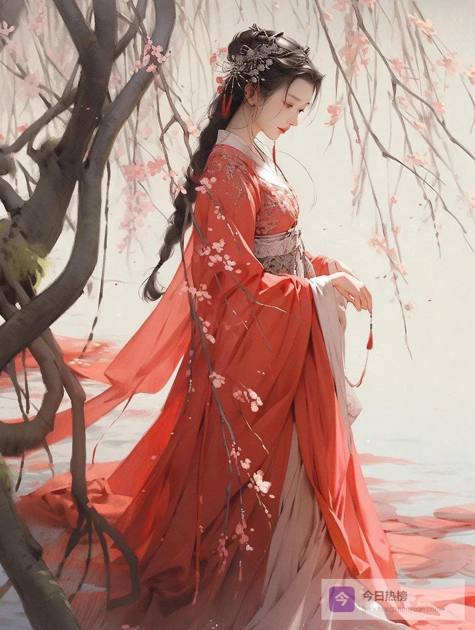 她用红袖半遮着脸,露出一侧精致的妆容,脸微微转过来,又轻轻地偏了回去。那种半遮半掩的姿态,比坦然相对更令人心荡神摇。她低着头,纤细白皙的手指假装在捻弄石榴裙上的带子,裙带上绣着双凤金线,可她分明什么都没有看,手指只是无意识地捻着,掩饰内心的紧张。