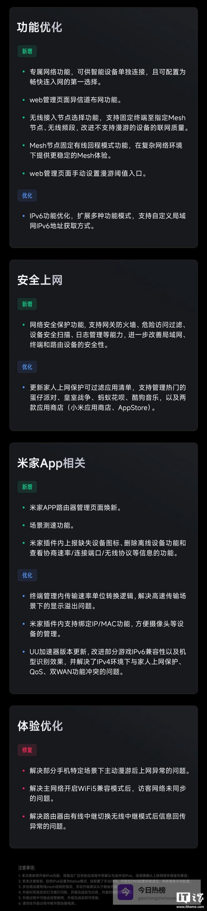 功能优化新增 专属网络功能,可供智能设备单独连接,且可配置为畅快连入网的第一选择。 web 管理页面异信道布网功能。 无线接入节点选择功能,支持固定终端至指定 Mesh 节点、无线频段,改进不支持漫游的设备的联网质量。 Mesh 节点固定有线回程模式功能,在复杂网络环境下提供更稳定的 Mesh 体验。 web 管理页面手动设置漫游阈值入口。优化 IPv6 功能优化,扩展多种功能模式,支持自定义局域网 IPv6 地址获取方式。安全上网新增 网络安全保护功能,支持网关防火墙、危险访问过滤、设备安全扫描、日志管理等能力,进一步改善局域网、终端和路由设备的安全性。优化 更新家人上网保护可过滤应用清单,支持管理热门的蛋仔派对、皇室战争、蚂蚁花呗、酷狗音乐,以及两款应用商店(小米应用商店、App Store)。米家 App 相关新增 米家 App 路由器管理页面焕新。 场景测速功能。 米家插件内上报缺失设备图标、删除离线设备功能和查看协商速率 / 连接端口 / 无线协议等信息的功能。优化 终端管理内传输速率单位转换逻辑,解决高速传输场景下的显示溢出问题。 米家插件内支持绑定 IP / MAC 功能,方便摄像头等设备的管理。 UU 加速器版本更新,改进部分游戏 IPv6 兼容性以及机型识别效果,并解决了 IPv4 环境下与家人上网保护 QoS、双 WAN 功能冲突的问题。体验优化修复 解决部分手机特定场景下主动漫游后上网异常的问题。 解决主网络开启 WiFi5 兼容模式后,访客网络未同步的问题。 解决路由器由有线中继切换无线中继模式后信息回传异常的问题。