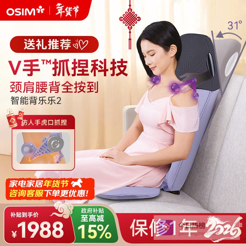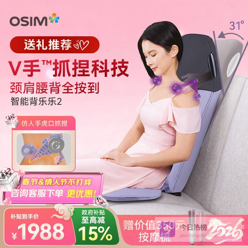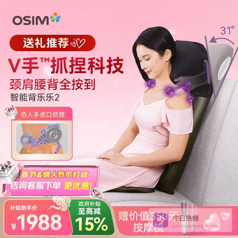 4、傲胜OS-2233这款OSIM傲胜OS-2233按摩器采用了仿人手揉捏技术,结合专利V手工艺,能够模拟真实手法,精准控制力度和节奏,带来深层的肌肉放松。它适用于全身多部位,特别是肩颈和腰背,能有效缓解肌肉紧绷和酸痛,让按摩体验更加贴合人体需求。