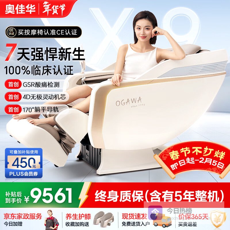 2、奥佳华X9pro+奥佳华X9 Pro+按摩椅配备了GSR酸痛检测装置,能够智能捕捉身体酸痛源,结合AI算法精准识别需求,改善按摩效果。它还拥有68种丰富的按摩手法,模拟大师级揉捏、滚轮运动和拉伸,能够全方位缓解酸痛,体验自然流畅的触感。