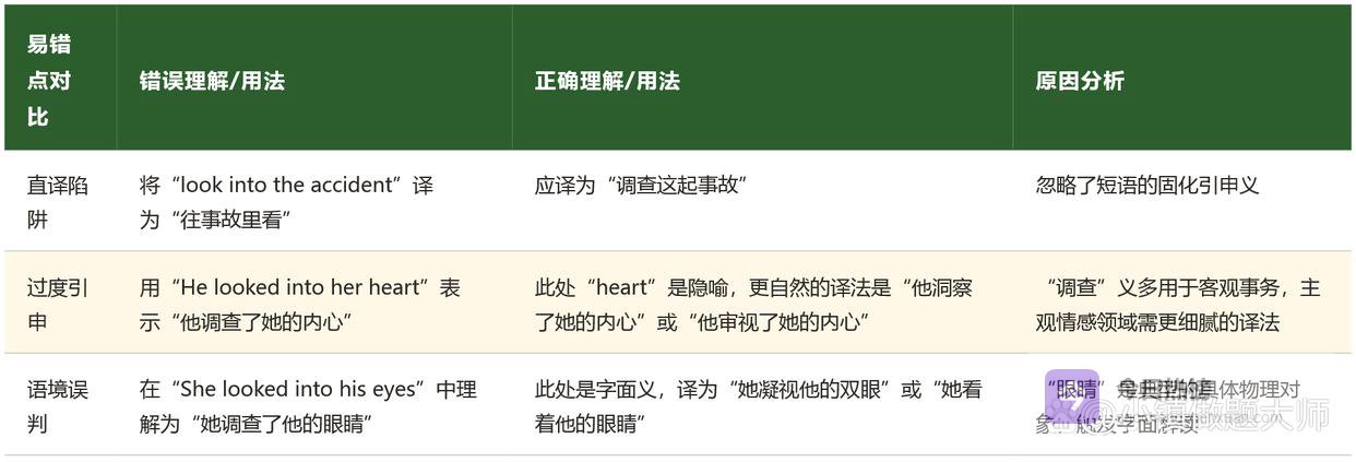 【重点】“Look into”的语义重心已从“看”的动作,转移到“深入探究”的过程。这是英语短语动词的典型特征:整体意义大于部分之和。掌握它,标志着从依赖字典翻译到理解语言文化的进步。
