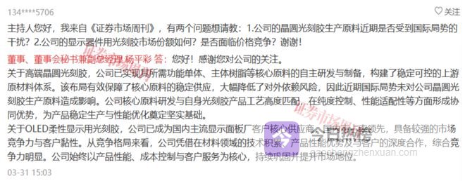 公司董事、董事会秘书兼副总经理杨平彩回复称,关于高端晶圆光刻胶,公司已实现其所需功能单体、主体树脂等核心原料的自主研发与制备,构建了稳定可控的上游原材料体系。该布局有效保障了核心原料的稳定供应,大幅降低了对外依赖风险,因此近期国际局势未对公司晶圆光刻胶生产原料造成影响。