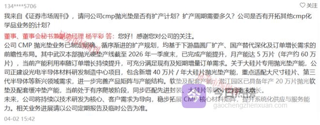 其指出,未来,公司将持续以技术研发为核心、客户需求为导向,稳步拓展CMP核心材料矩阵,提升系统化供应与服务能力。